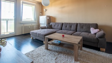 Byt se skládá z obývacího pokoje, ložnice, kuchyně, koupelny, samostatné WC a chodby, ze které jsou dostupné všechny zmíněné místnosti. Obývací pokoj má průchod do kuchyně a na balkón. Západně orientovaný balkón o velikosti 3m² a je zde instalováno zasklení, které se dá plně otevřít. Na stropě obývacího pokoje je podhledový ostrůvek s ambientním osvětlením, kamenem obložená TV stěna s nástěnným držákem na TV, žaluzie a závěsy. Vybavení OP: velký gauč, skříňky, konferenční stolek, skříňka pod televizi. Ložnice v klidné antracitové barvě s okny na západ, která jsou opět osazena žaluziemi a navíc venkovní roletou na dálkové ovládání. Podhledový ostrůvek s ambientním osvícením a bodovými světly. Vybavena je prostornou vestavěnou skříní, komodou a postelí.
