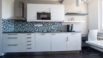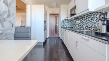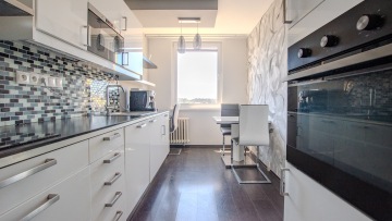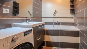 Nová moderní kuchyně je vybavena vestavěnými spotřebiči, el. varná deska, horkovzdušná trouba, mikrovlnná trouba, nová lednice a mrazák. Dále je zde jídelní kout se stolem a třemi židlemi. Koupelna s vanou, umyvadlem, topným žebříkem, pračka/sušička a zabudovaným radiem. Samostatné WC.