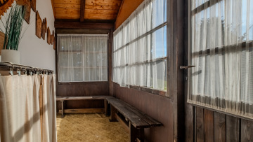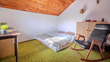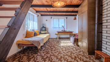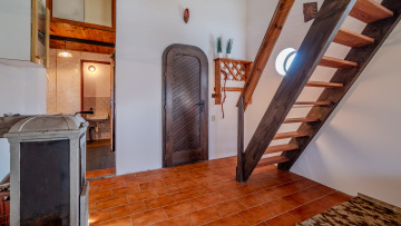Vstupem přes prosklenou verandu se dostaneme do obytné místnosti, kde je vestavěné patro se vstupem na jižně orientovaný balkón, ideální místo pro probuzení s výhledem do zeleně. Dále je zde kuchyňský kout se sporákem a spižírna. Vytápění je zde řešeno kamny na dřevo a voda je z vlastní studny. Chata je připojena k elektrické síti.