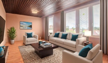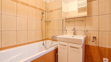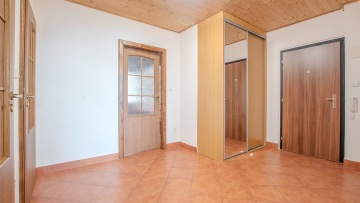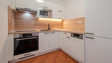 Vstupní chodba disponuje velkou vestavěnou skříní s dostatkem úložného prostoru. Z chodby jsou pak přístupné všechny další místnosti. Západně orientovaný obývací pokoj je krásně prosvětlený velkými okny. U televizní stěny je kamenný obklad. Praktická stěna odděluje obývací pokoj od moderní kuchyně. Součástí kuchyňské linky jsou vestavěné spotřebiče, indukční varná deska, horkovzdušná trouba, digestoř a myčka na nádobí. Meziprostor je využit jako jídelna. Dále se z chodby dostanete do dvou ložnic. Je zde jedna velká a druhá standartní skříň. Obě ložnice mají instalované předokenní rolety na dálkové ovládání. Koupelna s vanou, připojením na pračku na samostatné WC jsou ve stejném designu obkladu. Všechna okna v bytě jsou plastová s žaluziemi. Nemovitost se prodává částečně zařízená, kuchyňským koutem se spotřebiči a jídelním stolem s židlemi. Součástí fotodokumentace jsou dvě digitální vizualizace.